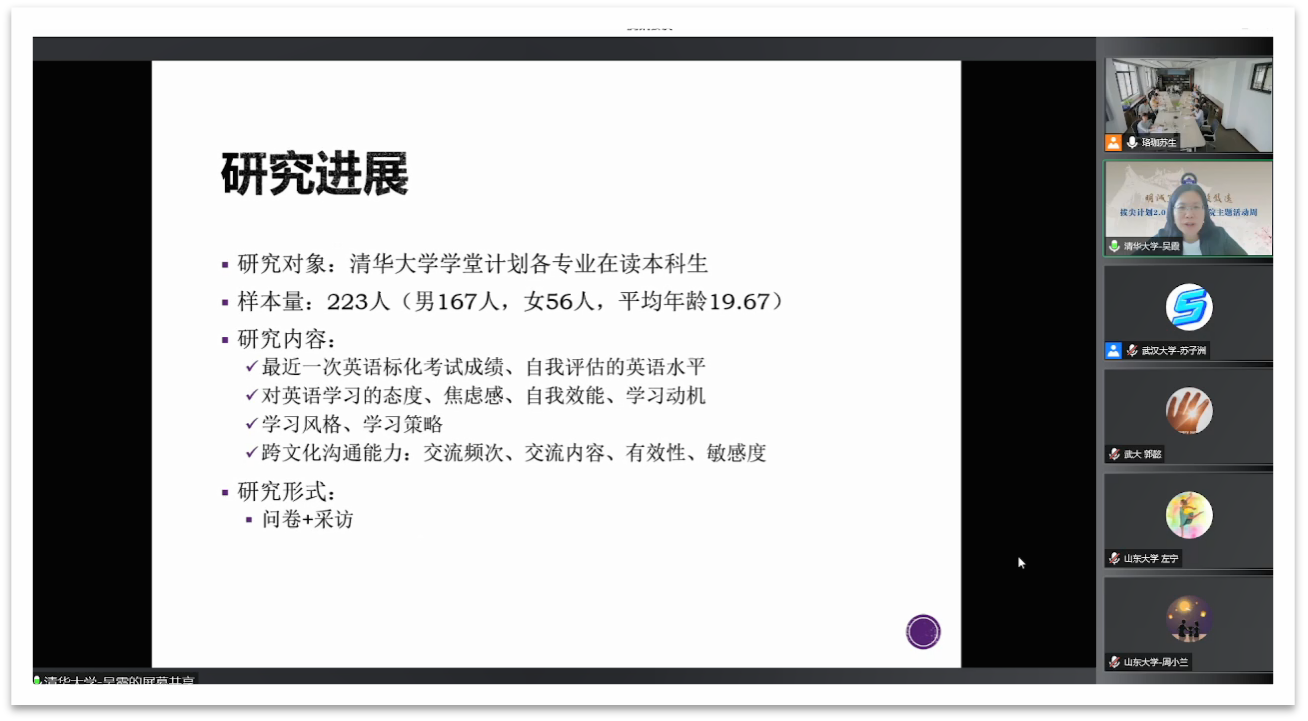 第二场活动为公共外语教学创新研究论坛。论坛形式为线上线下腾讯会议与直播相结合。弘毅英语教学团队在弘毅学堂实体会议室,实时连线清华大学、山东大学的专家学者和教学团队在腾讯会议共同磋商拔尖人才教学创新研究。武汉大学弘毅学堂院长石兢教授和海角社区