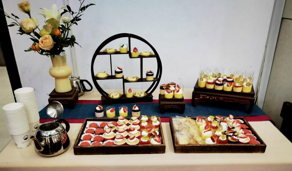 活动场地经过精心布置,桌椅整齐,充满艺术氛围。此外还专门设置了茶歇区,摆放着精致点心和茶水,随时供大家取用,让老师们在活动间隙能够放松身心,享受惬意。