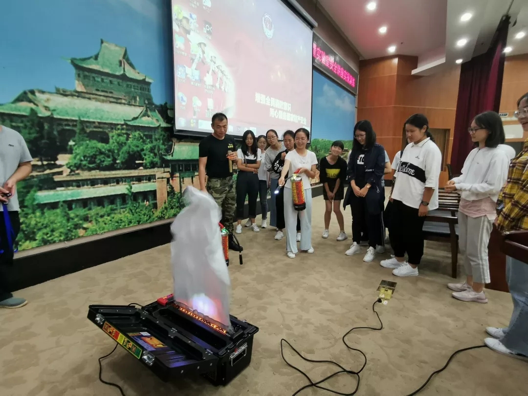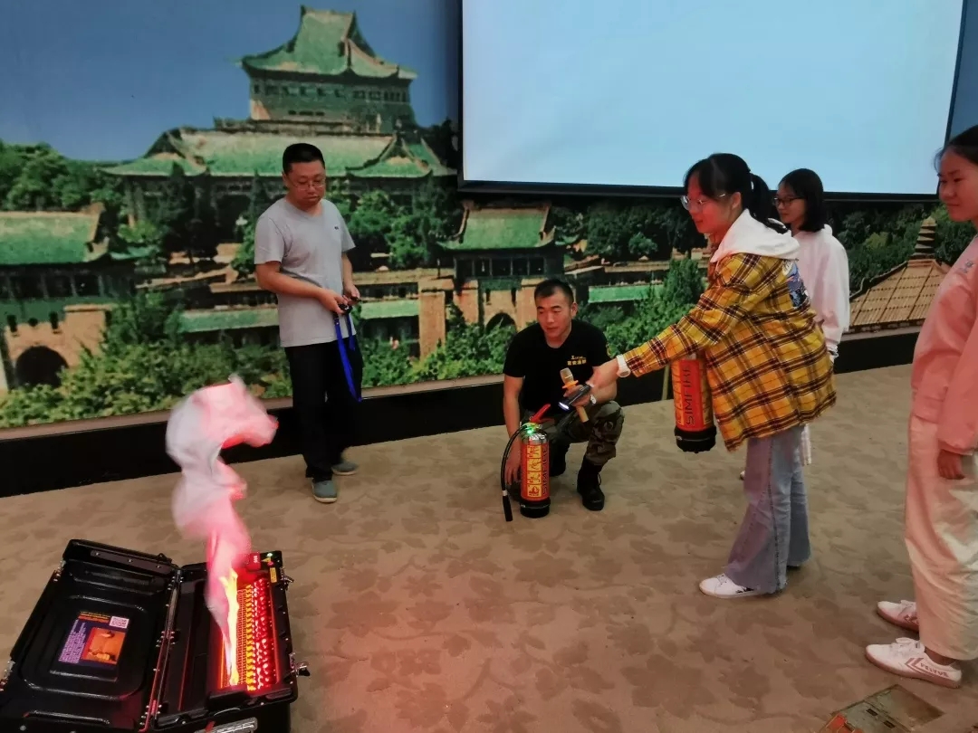在吴教官讲座的最后,他进行了现场实操,为同学们演示了灭火器的使用方法,并邀请了十余名同学亲自体验灭火器的使用,同学们在实际操作中切身熟悉了灭火器的使用方法,掌握了基本消防自救技能。