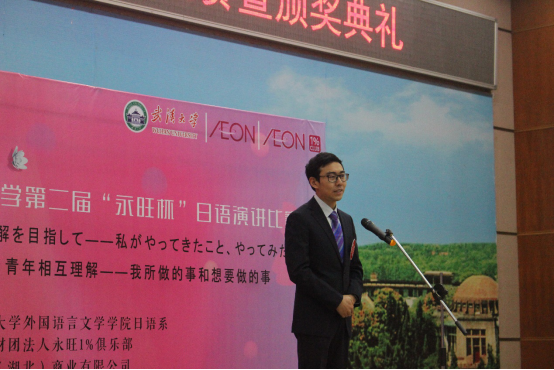 永旺(湖北)商业有限公司董事总经理杜若政彦代表永旺集团在致辞中表示,此次比赛武大学子的表现非常优秀,他感到十分欣慰,永旺1%俱乐部以及永旺集团各企业将继续资助,支持开展更多的文化交流等社会公益活动,希望青年一代早日成为中日两国友谊的使者和回报社会的主力军。