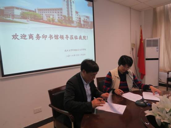马萧院长与商务印书馆英语编辑室主任马浩岚签署《英语习语大词典》(第2版)编写协议。