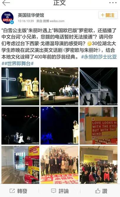 12月16日,武大外院学生代表队在武汉杜莎夫人蜡像馆参加了英国创意文化周暨英国圣诞季嘉年华开幕活动并再次献演《罗密欧与朱丽叶》的精彩片段。英国驻汉总领事卫亭瀚先生继头天晚上观看了华丽剧场版之后,再次观赏了此次的精华版演出,并且给予了高度的评价。