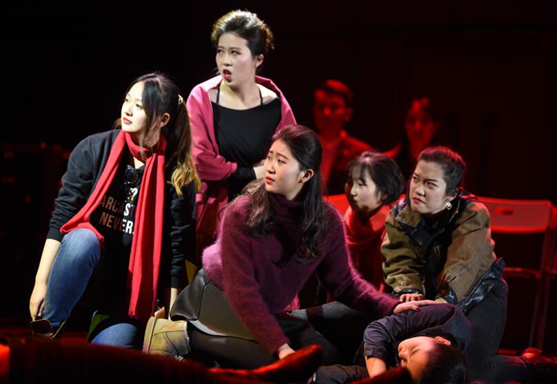 12月15日晚上七点,英语舞台剧《罗密欧与朱丽叶》在武汉时代•新世界的舞台拉开了序幕。一段富有感染力的音乐缓缓响起,二十五名学生演员依次登场站定。灯光打上舞台,演员们朗诵了一段气势恢宏的开场白。旁白的一声“Here is a fight”,场上的演员分为两拨开展了一场戏剧化的打斗。铿锵有力的鼓声营造出紧张刺激的氛围。随着亲王的出场裁决,一段凄美的爱情故事徐徐展开:英俊深情的罗密欧,美丽单纯的朱丽叶,高贵强势的凯普莱特夫人,幽默仗义的茂丘西奥,霸气勇猛的提波特,虔诚智慧的神父等每一个角色都表现得恰如其分。舞会上英式古典舞蹈的唯美,二人初次见面时的热烈,阳台会那一幕情人互诉衷情的诗意,在神父的见证下罗密欧和朱丽叶完成婚礼仪式的浪漫,以及敌人街头相遇从争吵到打斗的激烈,都牵动着观众的心。尤其是罗密欧和朱丽叶在最后双双殉情的场面更是将演出氛围推向了高潮,伴随着大提琴浑厚深沉和小提琴含蓄纯净的音乐演奏,台下观众被深深触动,还有人默默拭泪。最终,这出浪漫感人的悲剧在掌声中完美谢幕。