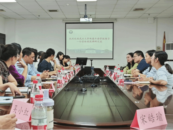 座谈会上,外校校长陈三军向参会老师们简要介绍了武汉大学附属外语学校的特色外语教学发展历程,以及与武大外语学院传承下来的深厚情谊,结合实例阐述了“多元培养、创享幸福”的办学理念,展示了近年来外语特色教育所取得的丰硕的办学成果。随后,外校随行的各语种老师纷纷就各学科所遇到的“升学与兴趣”“教学与科研”“走出去与引进来”“口语与阅读”“国际交流”等教学困境与外院各位老师进行了深入交流。外院各语种老师从高校教研的角度出发,结合高校所特有的资源,提出“与语言国家结对子”“开展跨文化活动”“教研结合推动课题合作”“以生为本合作育人”等建议,介绍了外院各语种的教师教学资源、外语文化节等大学生品牌活动,并表示今后将加强交流、资源共享,为武大外校的发展助力。会上还就外语学院学生赴外校实习建立实习基地事宜达成合作意向。