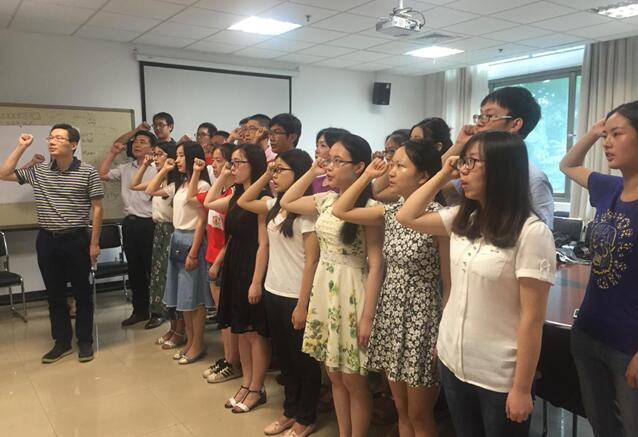 第一项,奏《国际歌》。王敏老师宣布会议开始,奏《国际歌》,庄严的歌声响起,全体起立,新晋党员们紧紧环绕在党旗周围,认真严肃。