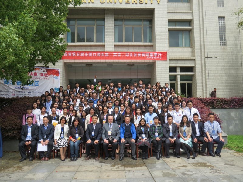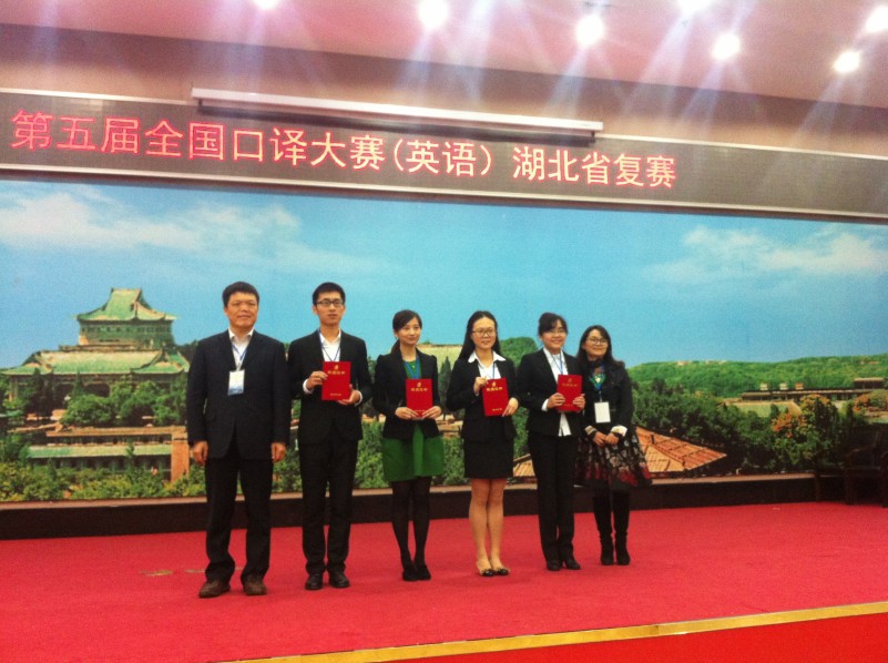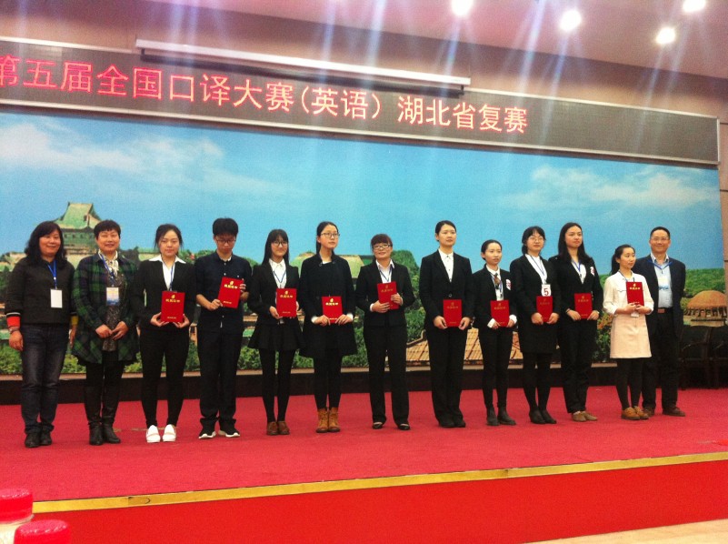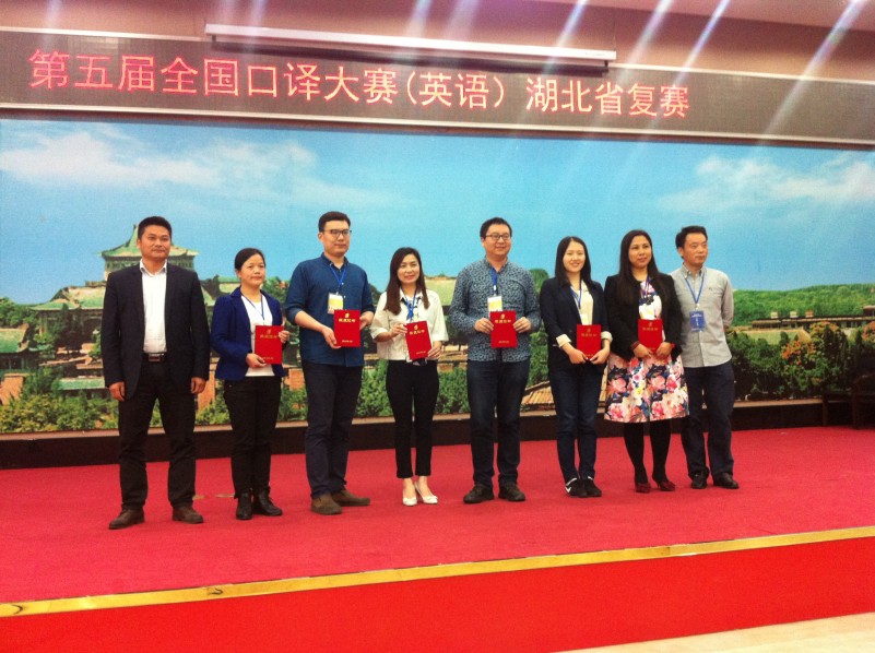 武汉大学翻译系胡孝申教授担任此次大赛评委组组长、湖北大学外国语学院副院长杨元刚教授、武汉工程大学研究生处处长陈明芳教授、武汉大学出版社高级编英文审谢群英、中南财经政法大学外国语学院曾静教授担任此次复赛评委;武汉大学翻译系主任马萧教授,副主任汪涛、熊伟,以及方兴教授、胡玲副教授等参与了此次大赛的评委及组织工作。武汉大学翻译系2015级MTI研究生为此次大赛提供了志愿者服务工作。下午4:30,经过近一天的紧张比赛,随着颁奖程序的结束,第五届中译杯全国口译大赛(英语)湖北省复赛完美落幕。