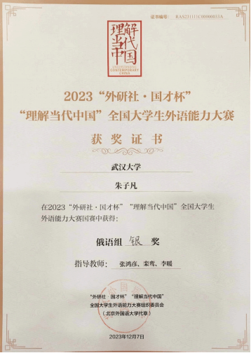 在俄语系张鸿彦、栾鸾、李暖三位老师的指导下,23级硕士研究生朱子凡同学历经校赛、省赛、国赛一轮、国赛二轮层层筛选,历时三个月,取得了优异成绩,荣获国赛银奖。
