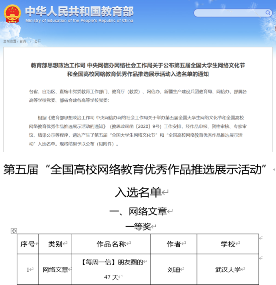 本科生辅导员刘迪的作品《朋友圈的47天》从报名的50000多件作品中脱颖而出,获网络文章类一等奖,武汉大学共3件作品获奖,这是刘迪老师于2021年获武汉大学辅导员标兵荣誉称号后再获表彰。