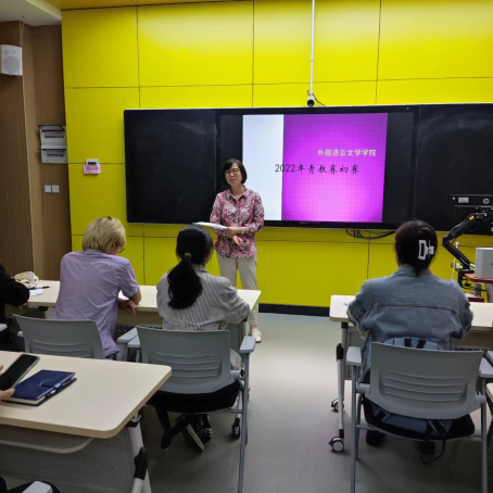 程向莉副院长宣布比赛规则,从教学内容、教学水平、教学为手段、教学效果、教学印象等五个方面进行评价,同时强调各位评委将秉承公平公正原则,打破系部藩篱,评选出五位代表外院水平的选手参加人文学部青教赛复赛。