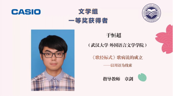 于恒超是日语专业2014级本科生,2018级硕士研究生,目前在日本京都大学攻读博士学位。其获奖论文《<歌经标式>歌病说的成立——以用语为线索》从比较文学的视角,运用中日两国古典诗歌理论以及音韵学、文献学等诸多领域的资料,对日本最早的歌学书《歌经标式》中的“歌病说”进行了详细考察,尤其针对歌学“用语”的来源、体系等进行了细致分析,提出了独到见解。