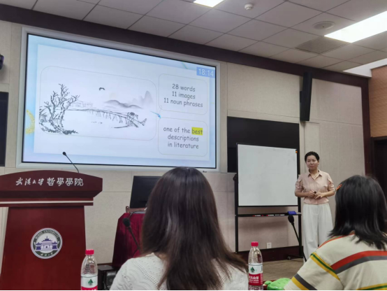 唐军俊老师讲授“描述文写作”,以一个概念、两个规则、三个步骤为框架,充分运用归纳法与演绎法,启发学生发现并运用描述文的写作技巧。以马致远的《天净沙》导入,用王熙凤、埃及艳后等经典描述为例,以武汉大学校园总结。穿越古今,联通中西,向师生们展示了一堂生动愉悦的写作课。