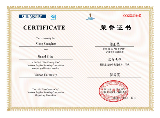 翻译系2020级熊正昊同学斩获大学组湖北赛区决赛冠军。在此之前举行的武汉大学校园选拨赛中,熊正昊表现优异,获得特等奖。