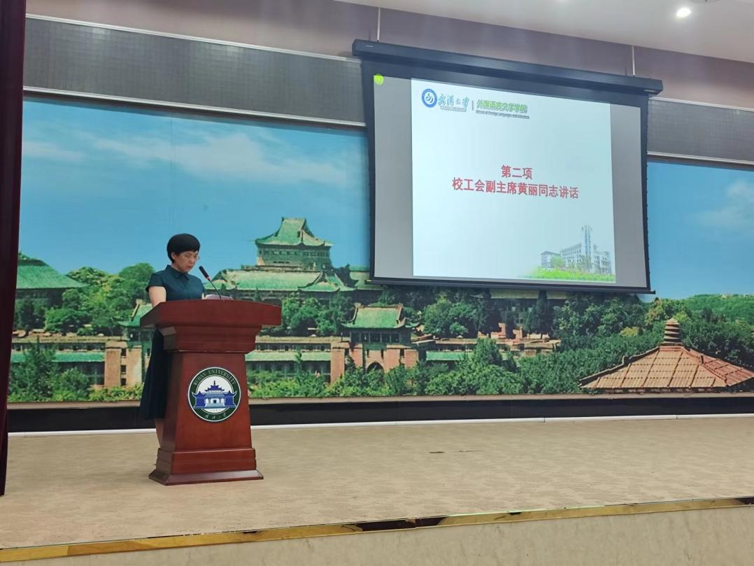黄丽代表校工会对本次大会的召开表示热烈的祝贺,向外语学院所有教职工在推进学院建设和学校工会发展中的所做贡献表示衷心感谢。她认为,近年来,院党政领导班子带领全体教职员工全面贯彻党的教育方针和学校工作部署,认真落实立德树人根本任务,坚持内涵式发展、高质量发展,学院综合实力和核心竞争力有所增强。学院工会在激发教师发展内生动力,形成民主决策、民主管理、民主监督的有效机制,推动学院高质量发展方面起到积极作用。她希学院工会在院党委的领导下,以习近平新时代中国特色社会主义思想为指导,贯彻落实党的二十大精神,履行好群团组织的职能,进一步调动广大教职工服务学院发展的主动性、积极性和创造性,团结带领全院教职工发扬主人翁精神,以高度的责任感和积极向上的工作热情服务于学校和学院的“双一流”建设。
