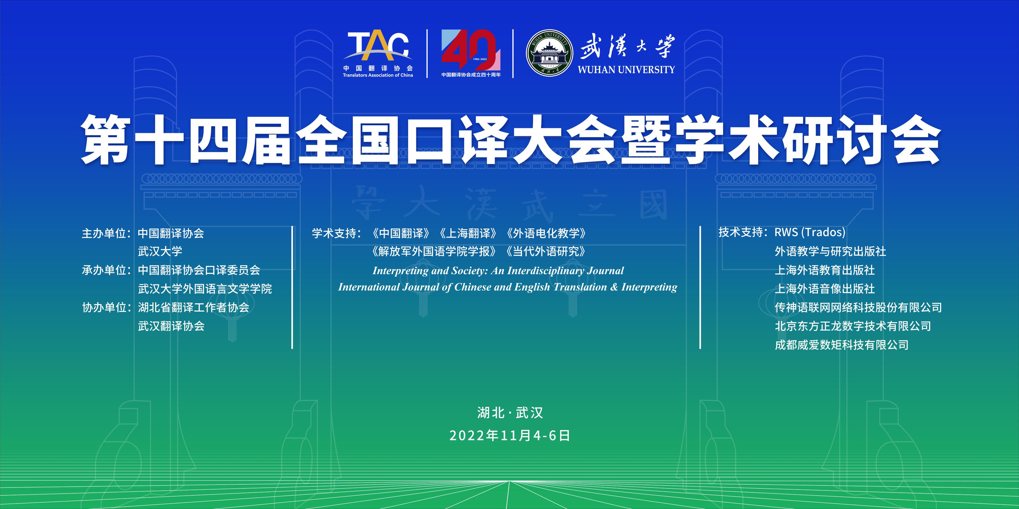 在这一背景下,中国翻译协会和武汉大学将于2022年11月4-6日在湖北武汉,以“面向国际传播的口译实践、教学与研究”为主题,共同主办第十四届全国口译大会暨学术研讨会。本届口译大会系“庆祝中国翻译协会成立四十周年系列活动”之一。诚邀全国口译界同仁莅临嘉会。
