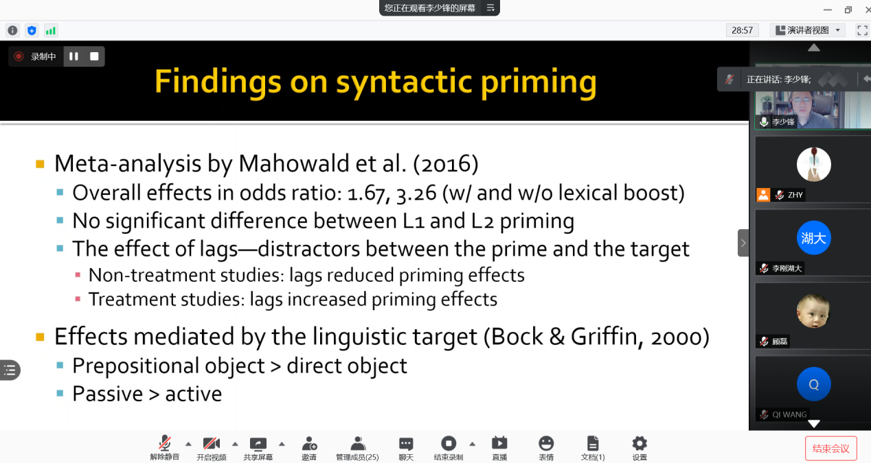 然后,李老师继续深入讲解句法前启,它是指个体在产生一个二语句子时,倾向于重复使用刚刚加工过的句法结构。李老师讲述了与前启相关的研究:前启涉及内隐学习,前启可以做为隐性语言学能的测量方式。他详细介绍了最新发表的实证研究来调查前启做为隐性学能的测量方式,他展示了研究问题(前启和其他隐性学能的测量方法的关系是什么?前启和外显学能的关系是什么?前启和二语学习成效的关系是什么?),研究方法包括其中使用的多种测试方法,讨论了研究结果,并为大家以后做此类研究提出了建议,如:确保学习者具备隐性知识,要使用多种方法测量隐性知识。