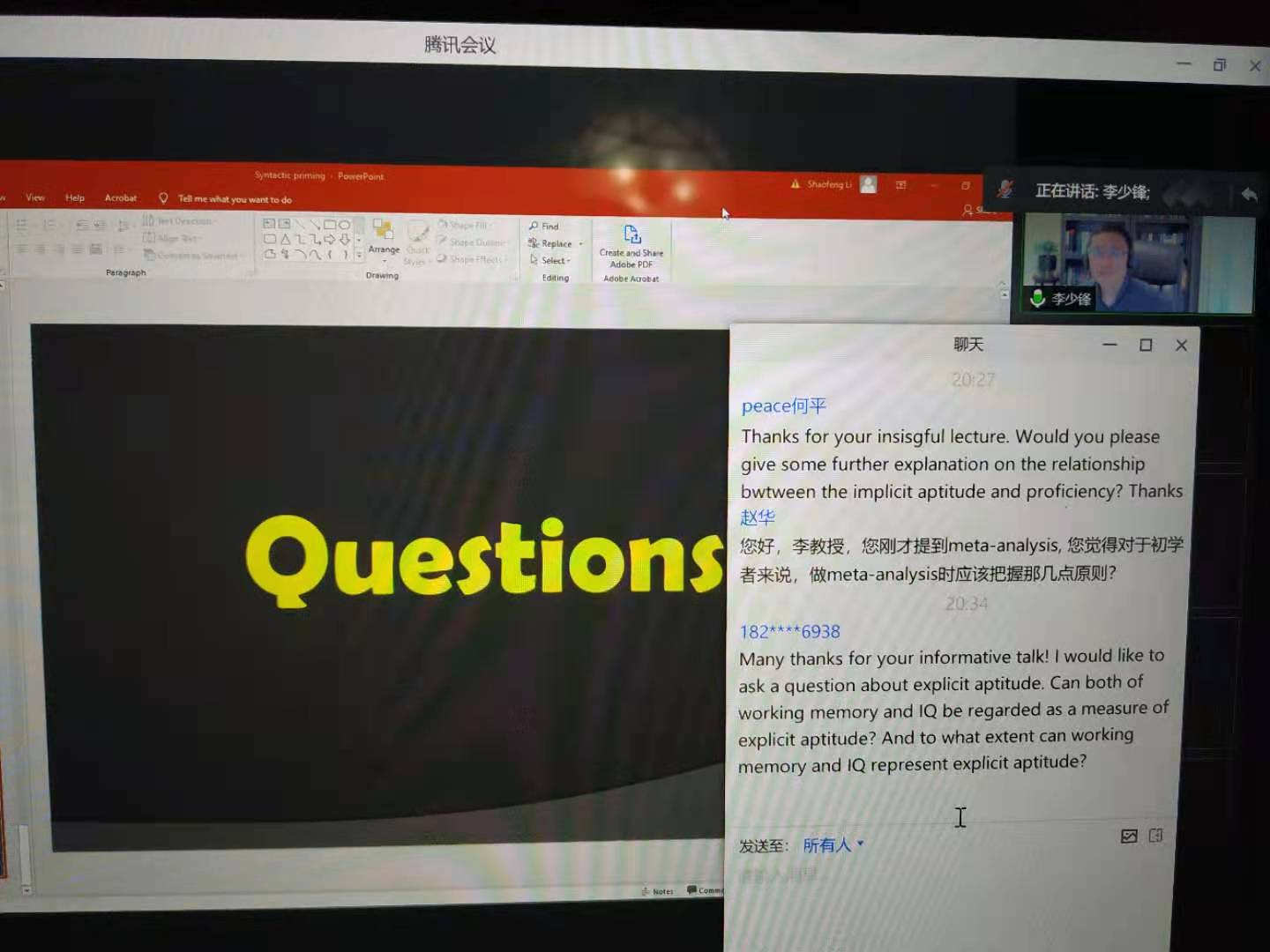 最后,线上听众积极提问,不仅在腾讯会议聊天框中输入问题,还现场连线李少锋老师,与李老师直接对话互动,讲座在热烈的讨论中进入尾声。