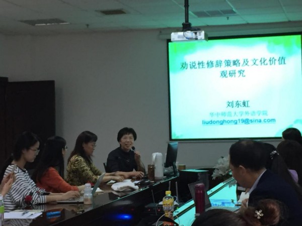 2019年10月24日下午3点40分,华中师范大学刘东虹教授应邀莅临武汉大学大学外语学院,在3008会议室做了主题为“劝说性策略及文化价值观研究”的学术讲座。讲座由外国语言所所长英文系邓鹂鸣教授主持,英文系张妍岩、李丹丽、刘庆荣、李映老师、大英部程向莉、桂敏等老师以及海角社区