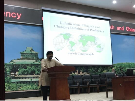 Canagarajah教授是美国宾夕法尼亚州立大学Edwin Erle Sparks讲席教授,曾任TESOL Quarterly主编及美国应用语言学协会年会主席。作为著名的后殖民英语教学理论和实践的倡导者,他首先介绍了两大对立的观点:世界英语观和标准英语观。基于语言使用者所面临的社会环境和交际需求的变化,Canagarajah教授对英语教学中的语言规则和语言能力进行了新的定位。他认为在后现代主义全球化环境下,标准英语的词汇、语法和语用等方面受到本土化的影响。“精通”英语不仅意味着掌握标准英语,而在于能够与不同种类的本土化的英语使用者进行交流。由此,语言教学的重点应该从对学生语法能力的培养转移到语用能力的培养。讲座期间,外院师生和Canagarajah教授就这一主题进行了热烈的讨论和互动。