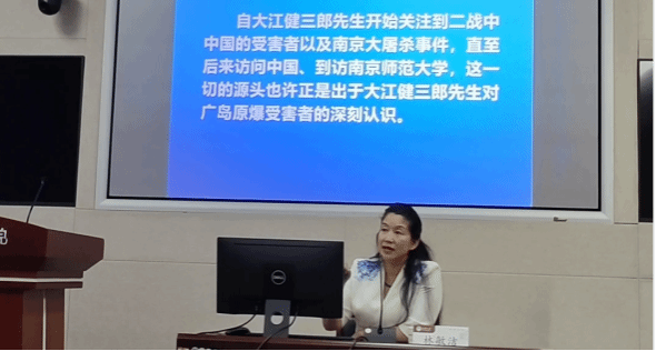 接着,林敏洁教授细致梳理了大江健三郎践行和平反战思想的活动轨迹。她认为,从对二战中中国受害者及南京大屠杀事件的关注,到后来的中国访问,大江健三郎和平反战思想的源头或许缘起于其对广岛原爆受害者的深刻认识,而从“广岛”到“冲绳”,再到“福岛”,将纵贯日本南北的地名串联成线的,是大江氏站在人类命运共同体的高度上一以贯之的反核反战的坚定立场与不懈努力。