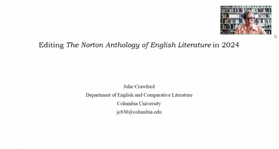 主办,浙江大学中世纪与文艺复兴研究中心协办的“何为文学?”:第三届外国文学与比较文学国际研讨会会前讲座在线上顺利举行。国际知名学者、哥伦比亚大学英文系讲座教授Julie Crawford就即将面世的第十一版《诺顿英国文学选集》的编辑过程与内容进行了约两个小时的学术讲座,来自国内外高校与科研机构的百余名师生参与其中。本次讲座由国际研讨会另一协办方上海外国语大学英语学院院长王欣教授主持,北京大学程朝翔教授、浙江大学郝田虎教授、武汉大学张国庆教授和张鸿彦副教授等出席讲座。